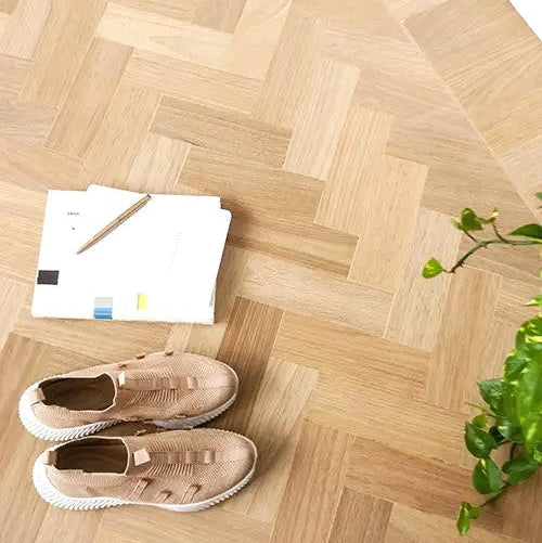 Pavimento em taco macheado de madeira maciça piquiá, de pequenas dimensões e sem acabamento.